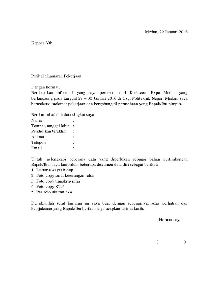 Contoh surat lamaran kerja dan cv terbaru, contoh surat lamaran pekerjaan bahasa inggris, tulis tangan, via email, guru, di toko / pt di job fair kamu akan . Pada contoh ini lamaran pekerjaan yang akan diajukan mengacu pada informasi lowongan kerja di event bursa kerja atau job fair. Sekar maju jl ahmad yani no. Contoh surat lamaran kerja untuk job fair · daftar riwayat hidup (cv) · foto copy kartu tanda penduduk (ktp) · foto copy surat keterangan lulus ( . Pas foto ukuran 4 x 6 cm · 2.